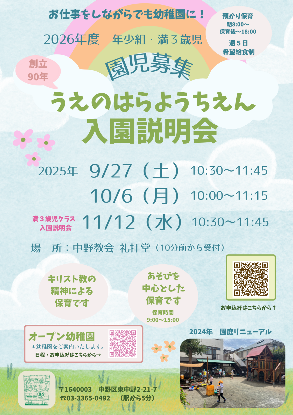 内容 | *当園の保育内容・方針・特色・入園についてお話します。 *年少入園(三年保育)希望者向けの説明会です。 *満3歳児入園をお考えの方も参加できます。(満3歳児クラス対象の説明会は、11月12日(水)に行います。) |